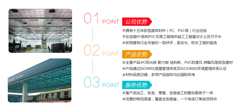 安徽天幕建材有限公司是一家專業(yè)從事PC陽光板,耐力板,結(jié)構(gòu)板,防腐瓦,采光石,有機(jī)板等高分子建筑工程材料經(jīng)銷批發(fā)和零售的公司,本公司從事板材和各類瓦銷售十多年,擁有完善的批發(fā)、零售、加工、工程設(shè)計(jì)、安裝施工、售后支持一條龍服務(wù)以及豐富的行業(yè)經(jīng)驗(yàn),銷售網(wǎng)絡(luò)遍及安徽各地,經(jīng)營代理多家品牌及自有品牌天幕系列的產(chǎn)品,是安徽地區(qū)首選的陽光板、耐力板經(jīng)銷商...